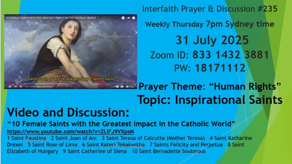 Vasantha & Siva Peri host an Interfaith Prayer meeting & discussion series, which takes place every Thursday evening, at 7 pm Sydney time.This weekly event is to foster devotional character of society and to bring understanding among friends, about the unifying nature of religions and their common foundation. Contact: periunity95@gmail.com